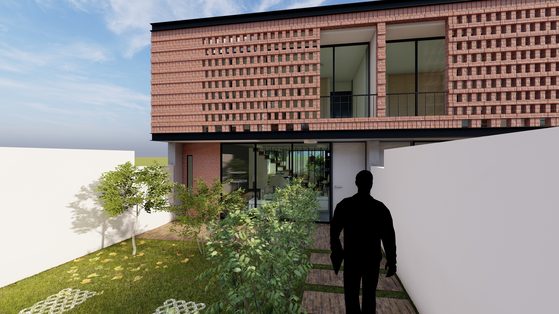Conjunto de 3 casas unificadas por fachada lineal continua. Ladrillo visto como elemento sostenible (producción local = menor huella energética). Solución bioclimática con materiales de proximidad.