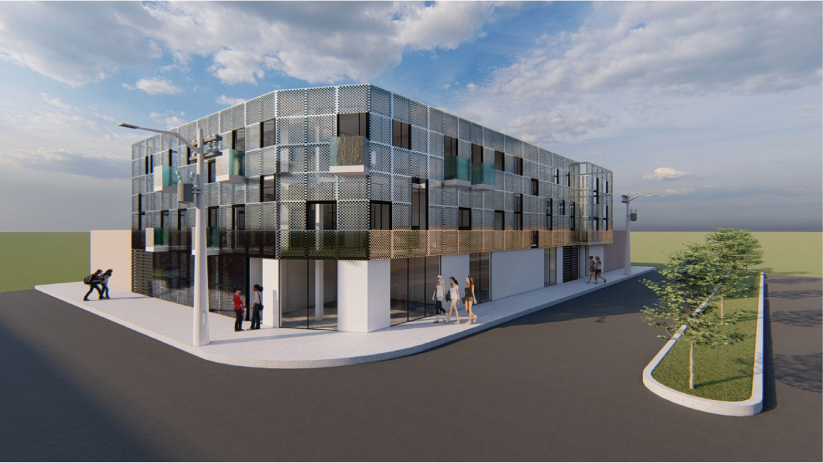 Nuevo volumen de 3 pisos con fachada de malla perforada, integrado a estructura existente. Programa: 3 locales + 4 departamentos, con jardines verticales. Presupuesto: USD 300K. Land Studio/Arq. Fuentes.